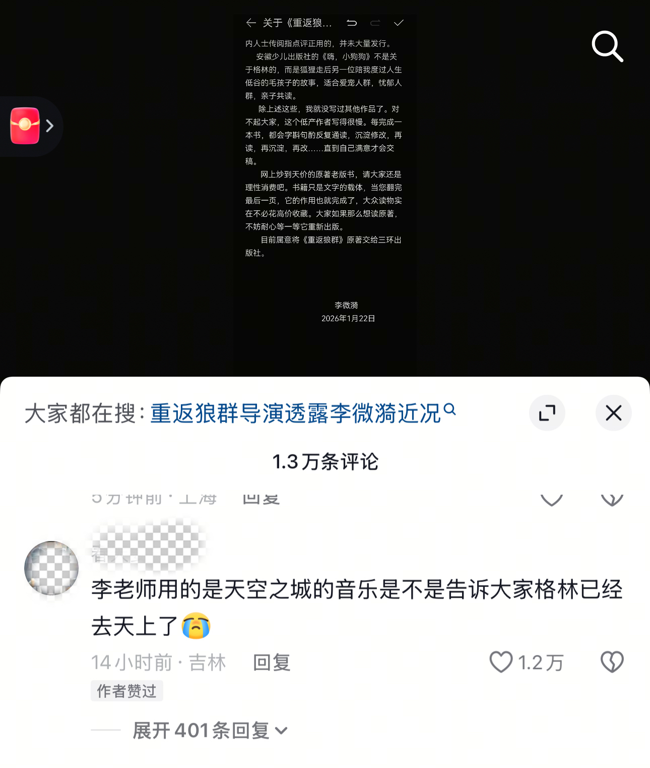 2026年1月22日,李微漪更新个人社交媒体账号,透露自己在自驾游途中,公布个人新书动向并回复网友关心的问题。有网友留言:“李老师用的是《天空之城》的音乐,是不是告诉大家格林已经去天上了?”李微漪账号点赞了该评论,没有回复。
