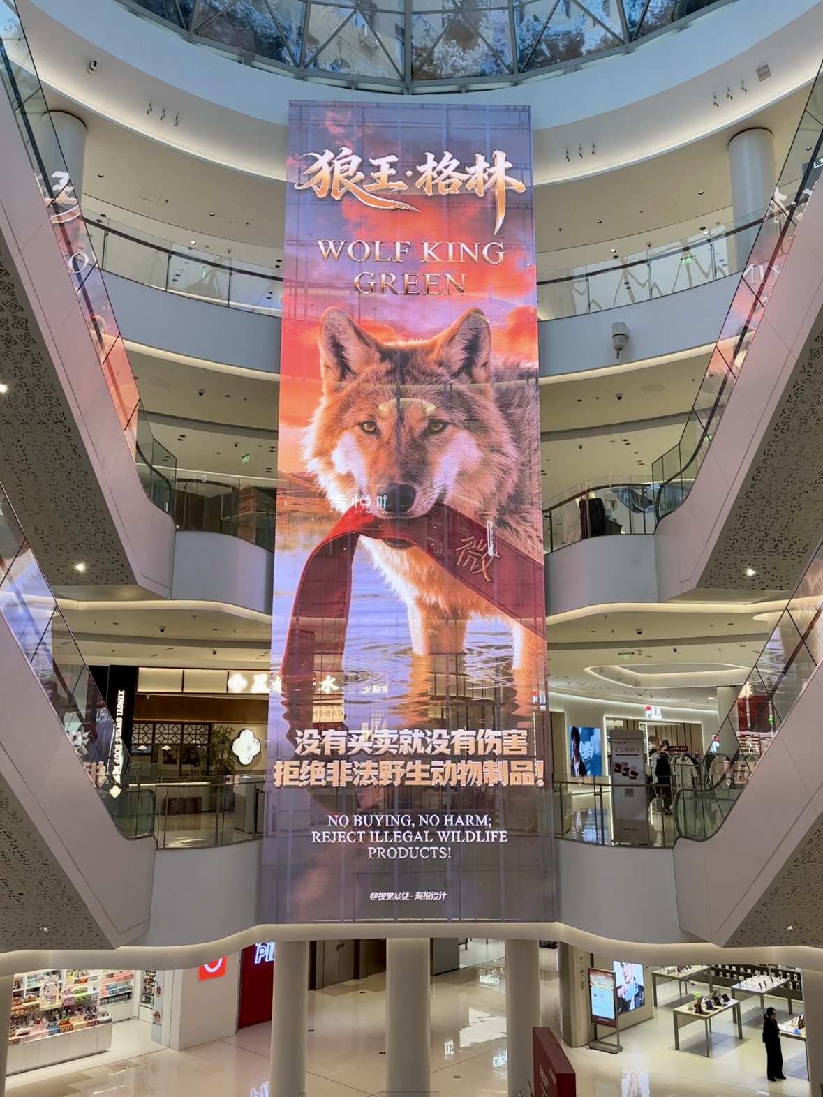 谈及发布格林相关内容原因,商丘正弘汇媒体对接人刘晴晴告诉封面新闻记者,“最近刷抖音看到《重返·狼群》的纪录片,心里非常感慨,觉得人和动物之间的羁绊非常微妙,特别感动。因此选择将格林的海报在商场投屏,想给大家树立动物友好的概念,呼吁人跟动物双向守护。”山东潍坊吾悦广场媒体负责人任女士也告诉封面新闻记者:“格林再次冲上热搜,再看也是很感动。我们也想借此机会,呼吁大家反对野生动物制品。这几天很多人都来线下打卡。”