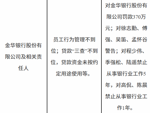2月9日,国家金融监督管理总局金华监管分局行政处罚信息公开表显示,金华银行股份有限公司因员工行为管理不到位;贷款“三查”不到位,贷款资金未按约定用途使用等被罚款370万元。责任人徐某勤、傅某、吴某、孟某谷被警告;程某伟、季某松、陆某被禁止从事银行业工作5年,高某、陈某被禁止从事银行业工作1年。